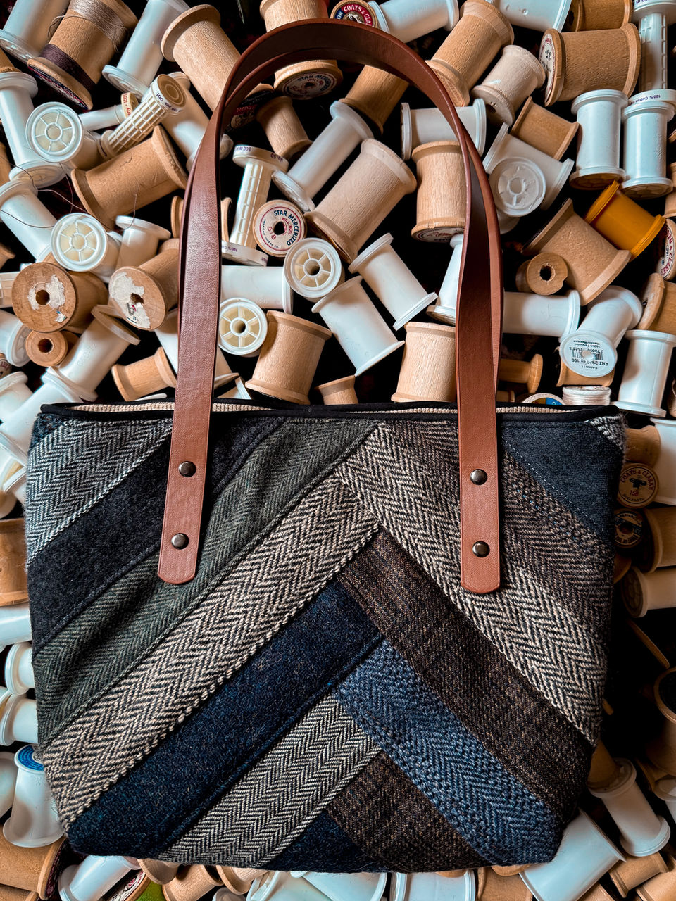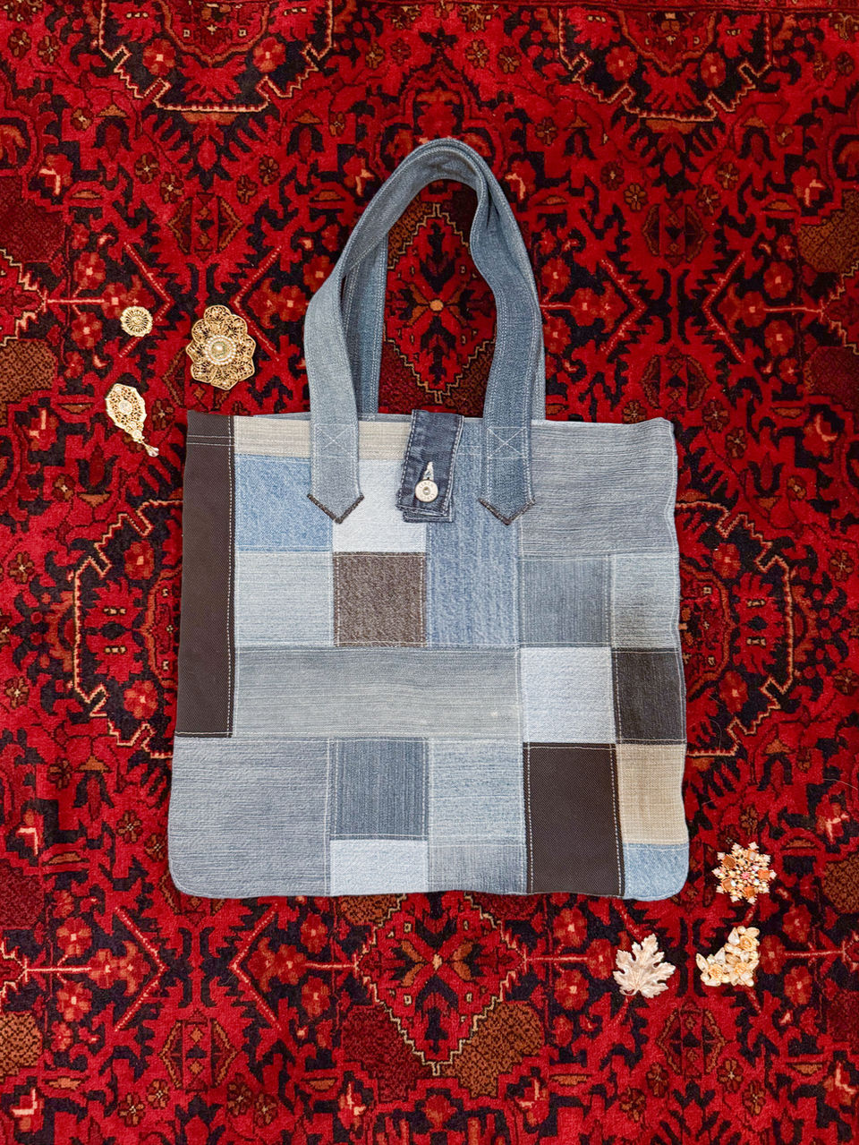 Every bag begins with a story - a forgotten jacket, a faded pair of jeans, a once-loved sweater, a stack of vintage ties. Flora wanders through garage sales, thrift stores, resource centers, and friends' closets, gathering fragments of lives once lived, textures once cherished. From these cast-off materials, she creates extraordinary, one-of-a-kind bags — each one a small work of functional art. A man's suit becomes a sophisticated tote. Denim strips are woven into new strength. Shrunken wool and silk ties find new harmony in color and pattern.